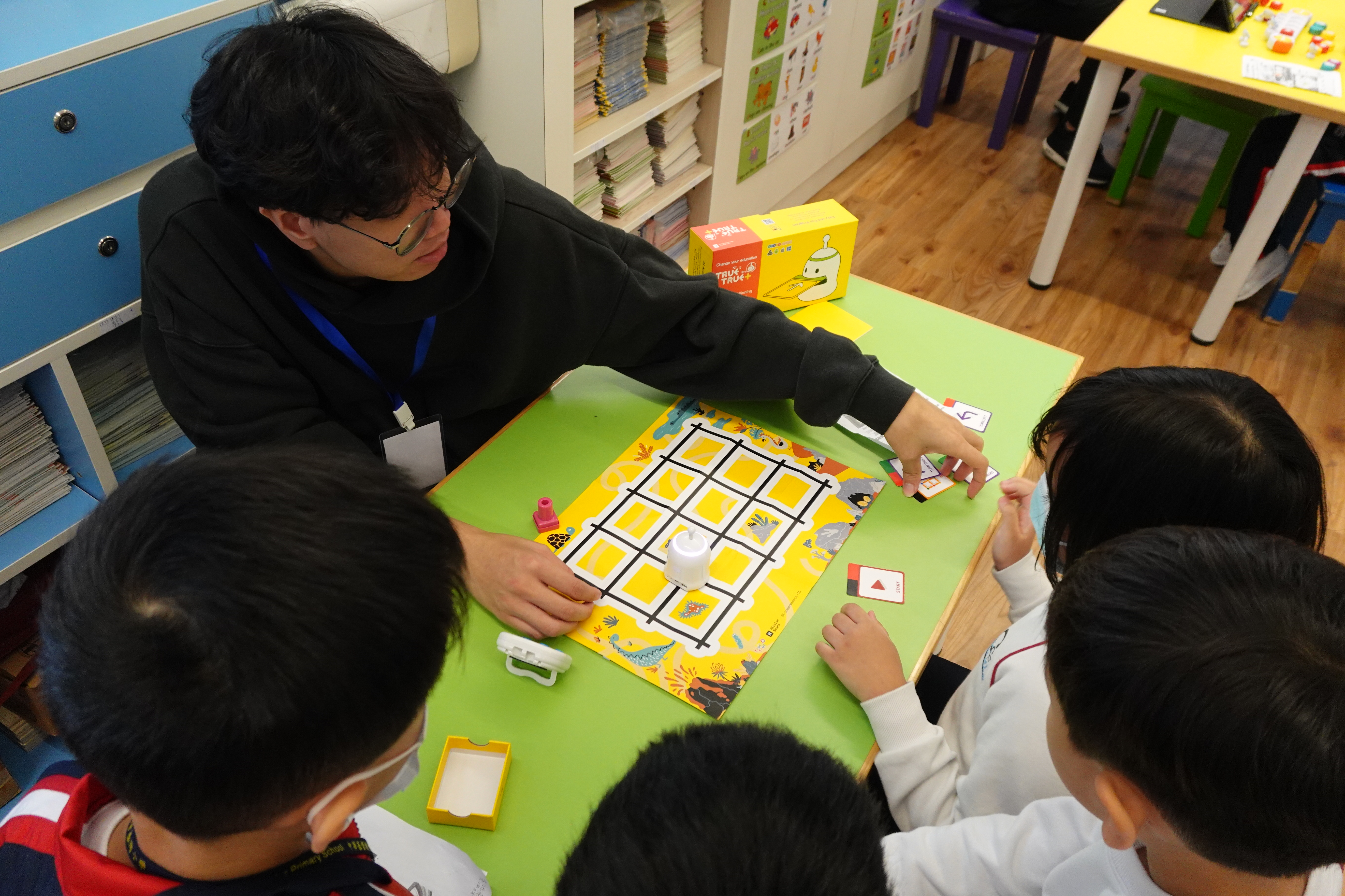 TrueTrue 編程課程 專為兒童設計,是不插電的編程學習工具。學生透過色卡編碼與線條追蹤讓機器人動起來,並利用其運動偵測功能,在無螢幕的環境下學習序列、迴圈等程式概念,培養運算思維。